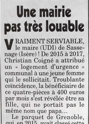 Nous avons déjà dénoncé, à plusieurs reprises (ici et , par exemple), l’attribution d’un logement d’urgence par  le Maire à sa fille au cours de trois longues années. Le Procureur de la République avait été saisi au sujet de cette affaire dès 2015. En attendant la décision définitive du parquet,  cette affaire suscite l’intérêt de la presse nationale. Ce mercredi 11 avril 2018, les procédés du Maire ont fait l’objet d’un article dans Le Canard enchaîné, où l’on signale que le parquet de Grenoble vient de rouvrir le dossier. L’article intitulé « Une mairie pas très louable » mentionne aussi l’attribution des logements d’urgence à d’autres administrés dans des conditions insolites. Ces « veinards n’étaient pas toujours en situation d’urgence », d’après Le Canard. Enfin, l’article rappelle que « la commune ne brille guère par sa générosité en matière de logements sociaux […] et paie des lourdes amendes au Trésor » et que Christian Coigné ne peut pas jouer les naïfs, parce qu’il est vice-président du Département chargé… du logement !